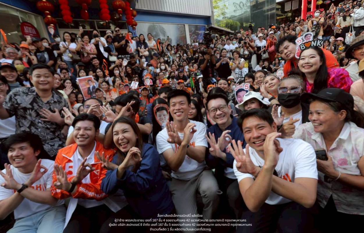 태국 총선 기간 인민당(People’s Party) 당 대표 낫타퐁 르엉빤야웃(Natthaphong Ruengpanyawut)와 그 지지자들. 출처: People’s Party