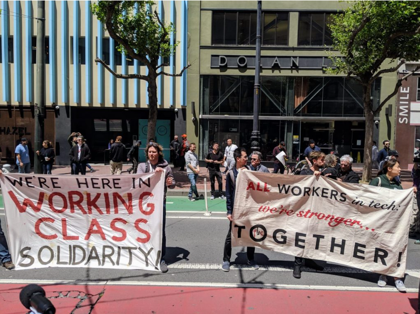 2019년 5월 8일 샌프란시스코 우버(Uber) 본사 앞에서 열린 리프트(Lyft)와 우버 운전기사 파업에서 기술 노동자 조직가들이 시위에 참여하고 있다. 출처: 쉬미 리(Shimmy Li) / 베이 에어리어 커런트