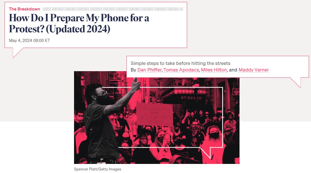 시위 참석할 때 휴대전화 관리 방법The Markup2020년에 게시된 시위를 위해 휴대전화를 준비하는 방법에 대한 업데이트 버전이다. 시위에 참여하기 전에 시위자나 관찰자는 휴대전화가 법 집행 기관의 감시 전술에 노출될 수 있다는 점에 유의해야 한다.