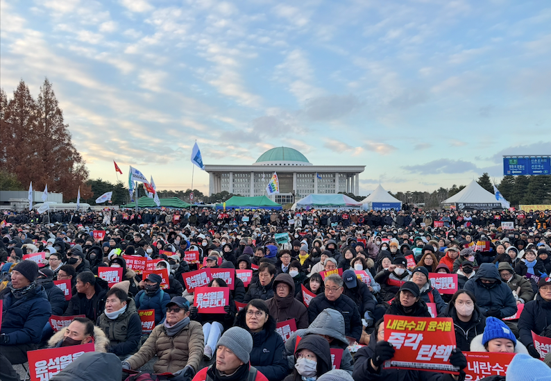 7일 저녁, 윤석열 탄핵안 표결을 앞두고 국민의힘 의원들이 본회의장을 빠져 나갔다. 김건희 특검법을 부결시킨 직후다. 표결을 지켜보던 국회 앞 100만 명의 노동자와 시민은 분노했다. 이제 "국회의 시간은 끝났다", "이제는 퇴진의 시간, 투쟁하는 민중의 시간"이라는 목소리가 터져 나왔다. 촛불 시민들은 국회를 에워싸고 "우리가 끌어내리자"고 외쳤다.