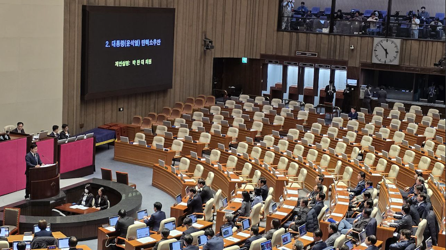 야당 의원들은 국민의힘 의원들의 퇴장 후에도 탄핵안 표결을 이어갔다. 우원식 국회의장은 표결 종료를 보류하고 국민의힘 의원들이 국회로 돌아와 표결에 동참할 것을 기다리겠다고 밝혔다. 홀로 본회의장에 남은 안철수 의원과 함께 돌아온 국민의힘 김예지, 김상욱 의원도 표결을 마쳤다. 이들 셋을 제외하고 더 이상 돌아오는 국민의힘 의원들은 없었다. 9시 20분경, 국회는 표결을 종료했다. 탄핵소추안은 결국 의결정족수를 채우지 못해 투표 불성립으로 자동 폐기되었다.