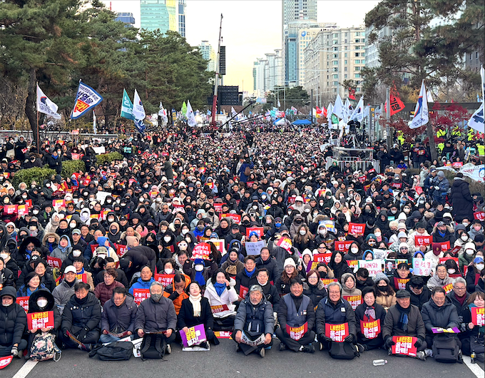 민주노총은 지난 "12.3 내란 사태"이후 4일 오전, 윤석열 퇴진 시까지 전 사업장 무기한 총파업을 선포했다. 철도노조, 전국교육공무직노조, 전국학교비정규직노조, 전국여성노조, 금속노조 등 파업에 나선 노동자들은 집회와 행진에서 길을 내고 광장에서 촛불을 든 시민들과 함께 싸우고 있다.