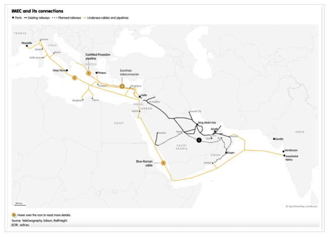 그러니 이제 IMEC의 목표, 주요한 난관들, 그리고 미국이 동시에 저지하려 하고 있는 회랑들을 함께 살펴보자.