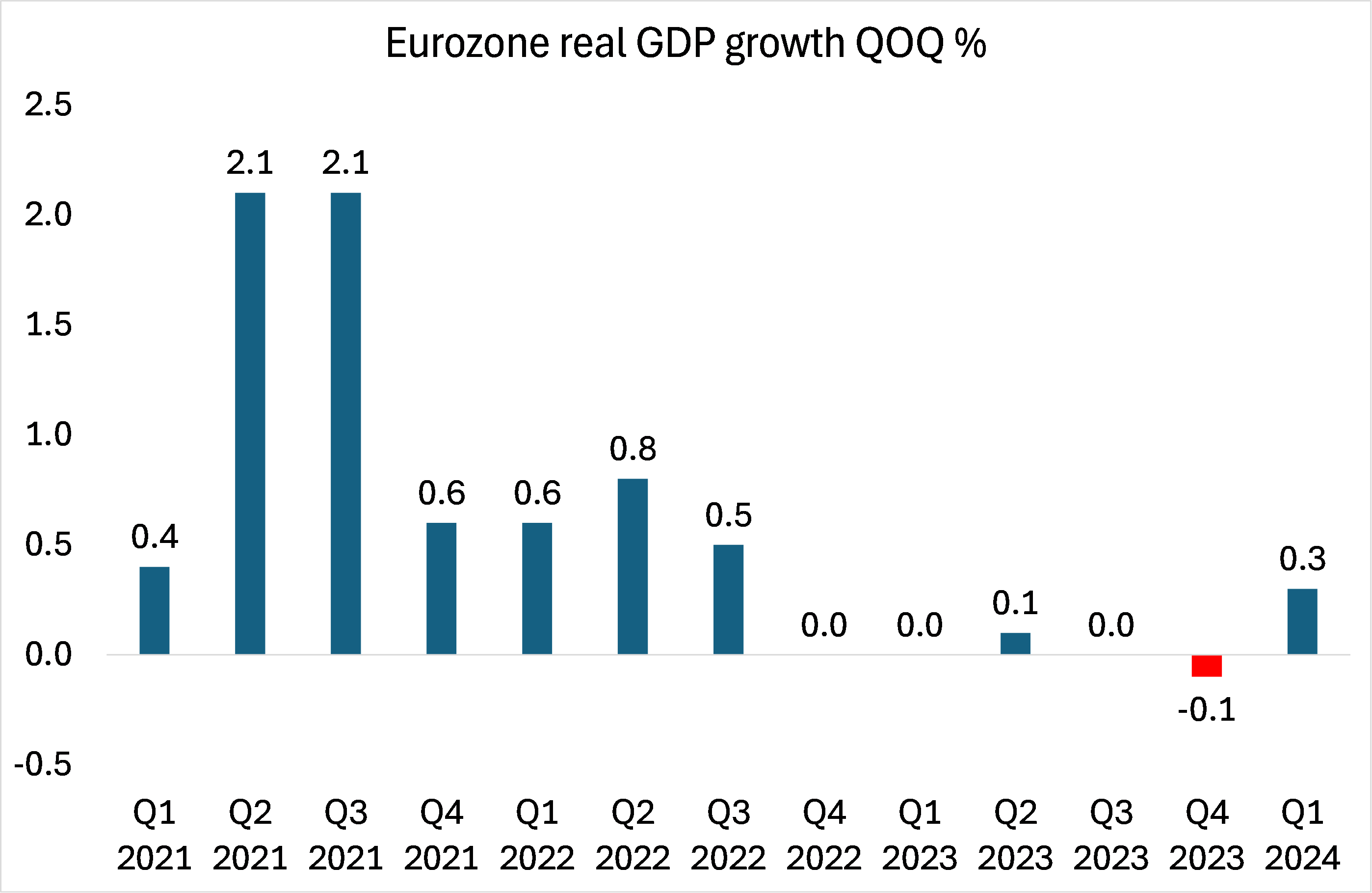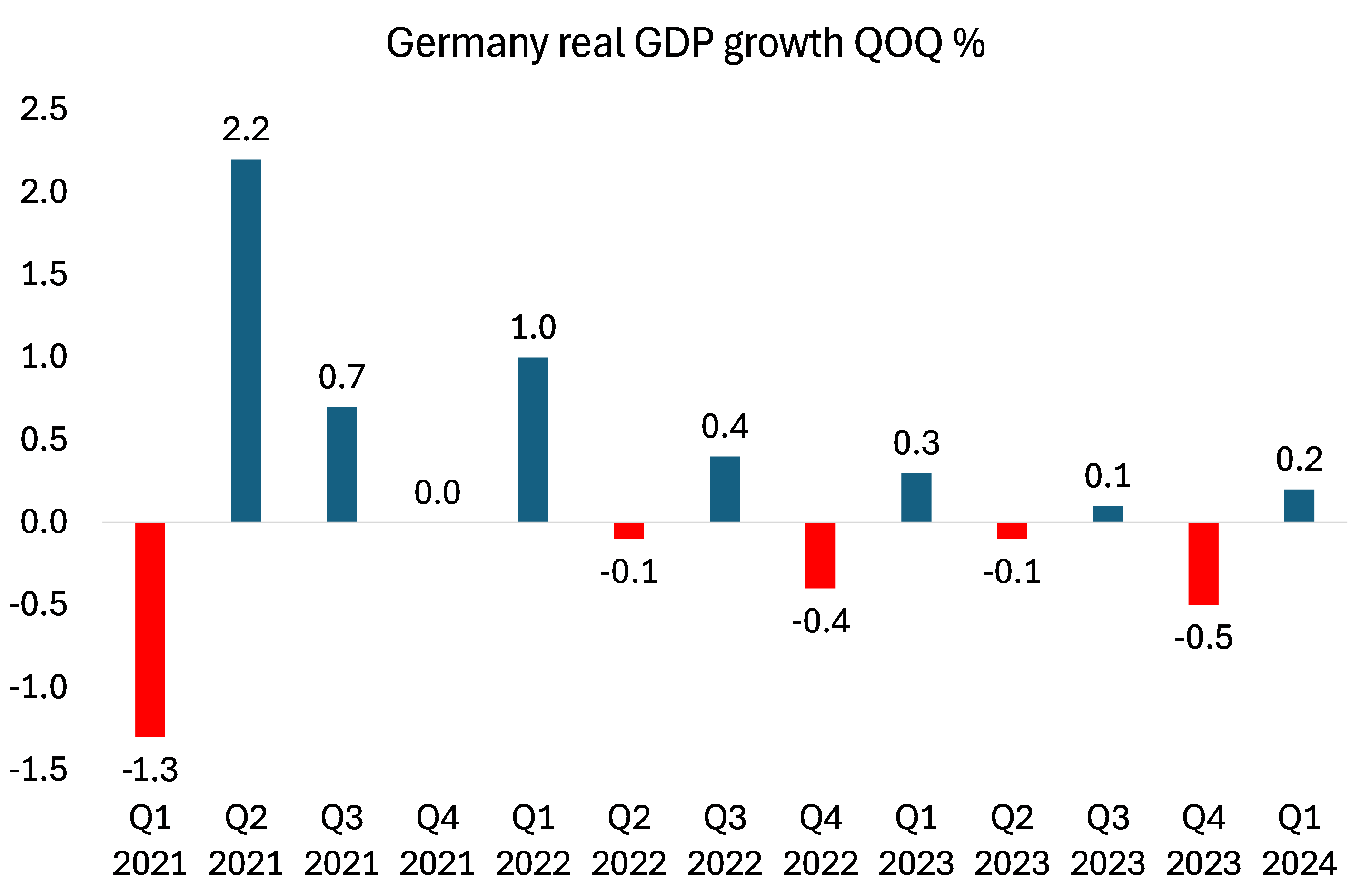 유로존 자체를 자세히 들여다보면 유럽의 제조업 강국이었던 독일 경제의 재앙을 제대로 파악할 수 있다. 2021년 이후 12분기 중 5분기 동안 경기가 위축되었고 1%를 넘은 분기는 단 한 분기뿐이다.