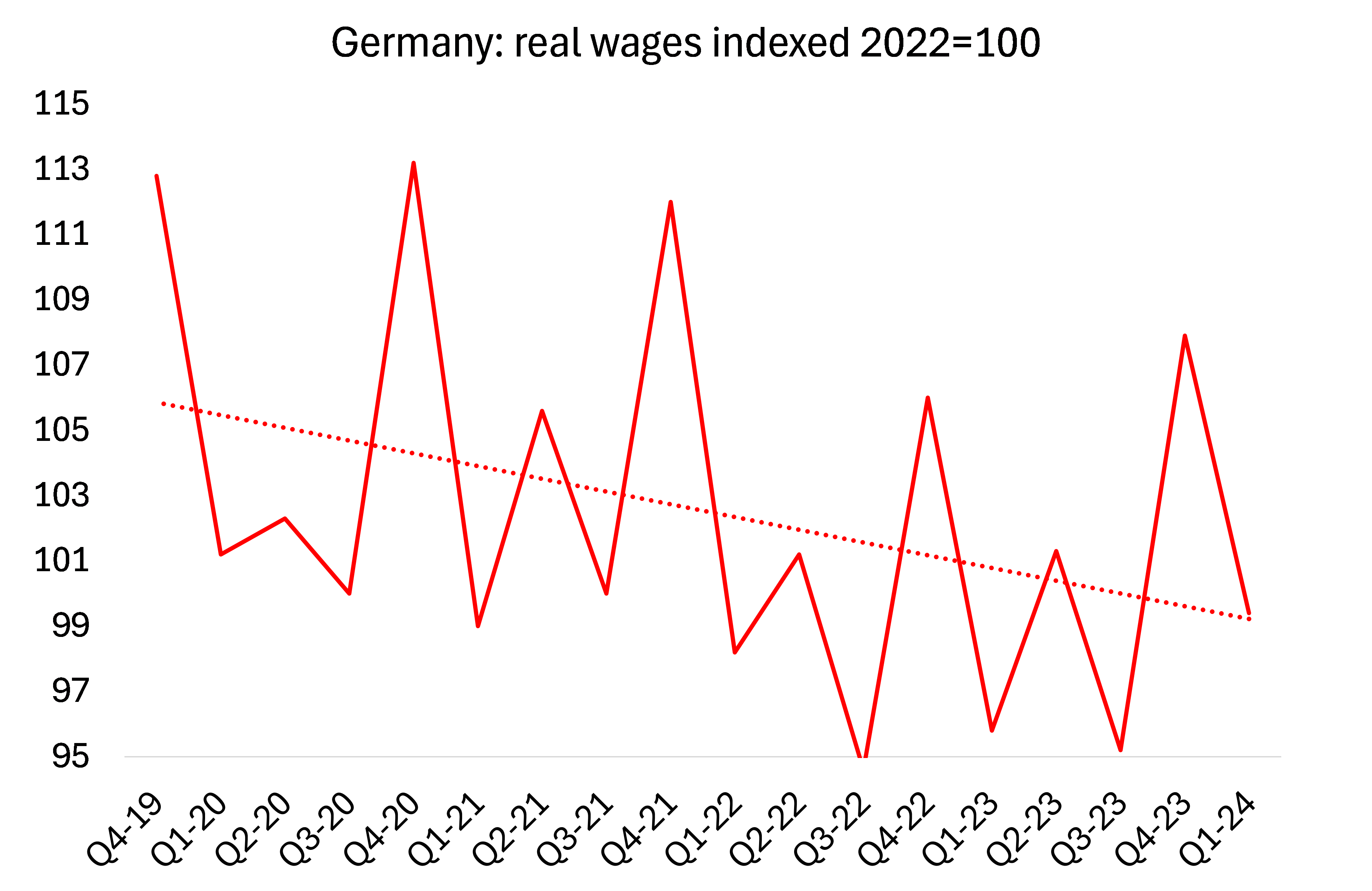 지난 4년 동안 독일 노동자의 실질 임금이 급락한 것은 당연하다. 2020년 하반기 완만한 회복세에도 불구하고 2023년 팬데믹이 끝난 이후 무려 6%나 감소했다. 그리고 최근 유럽의회 선거에서 독일의 '강경 우파' 정당들이 선전한 것도 당연한 일이다.