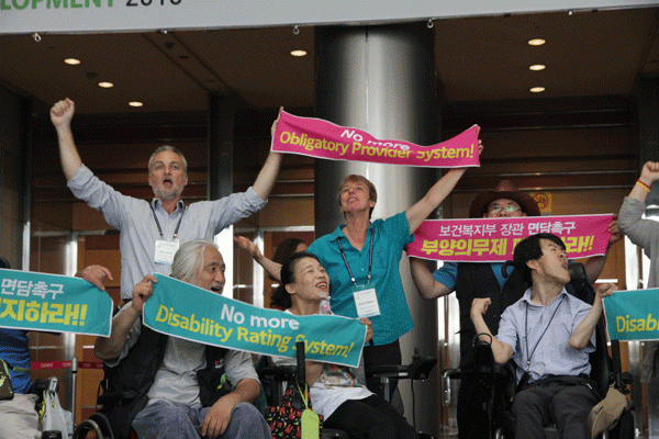 세계사회복지대회에서 장애등급제-부양의무제 폐지를 촉구하는 기습시위에 국제 사회복지계는 ‘연대’로 답했다.