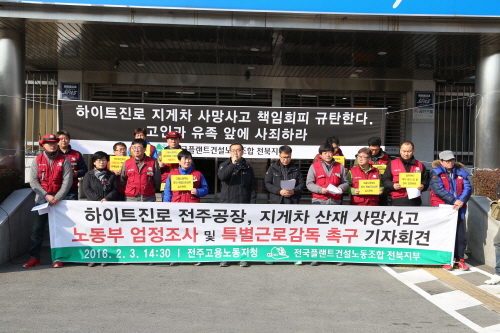 2일 오전 하이트진로 전주공장에서 발생한 지게차 산재 사망사고가 공장 측의 산업안전관리 허술로 인하여 발생했다는 주장이 제기되고 있다.