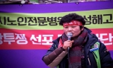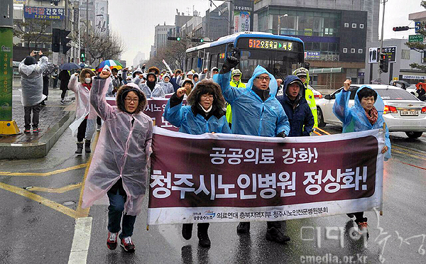 민주노총 충북본부는 12일 오후 4시 청주시청 앞에서 청주시의 노인전문병원 농성장 불법 폭력 강제철거 규탄대회를 열었다.