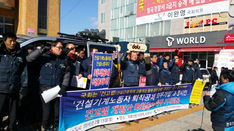 전국건설노동조합은 전국 각지에서 '건설근로자의고용개선등에관한 법률(약칭 건고법)' 개정안의 국회 통과를 위한 기자회견을 열었다.