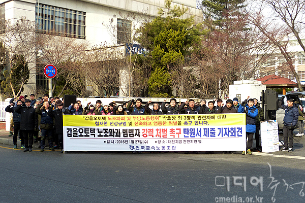 전국금속노조 충남지부 갑을오토텍지회와 민주노총 세종충남본부 등 노동계가 갑을오토텍 사업주 등의 노조파괴 행위에 대해 엄중하게 처벌해야 한다고 재...