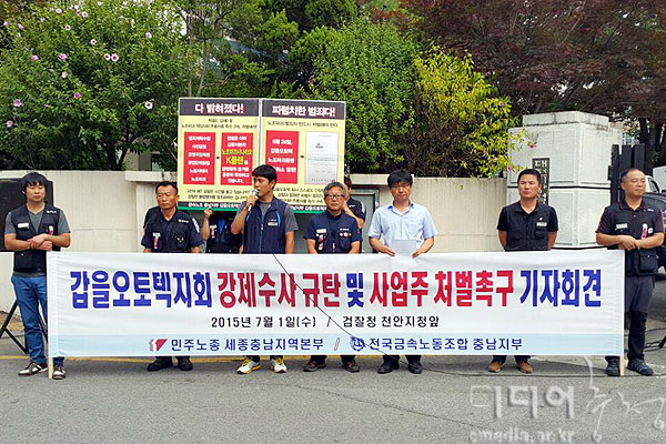 금속노조 갑을오토텍지회가 대전지방고용노동청 천안지청장 안모 씨와 충남 아산경찰서장 윤모 씨, 일부 경찰관들은 형법상 직무유기로 2일 경찰에