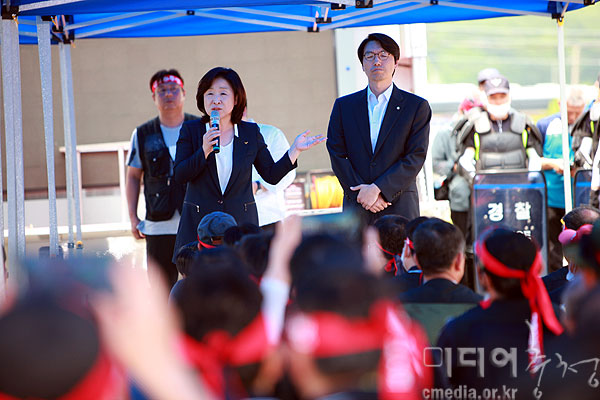 갑을오토텍 사측 임태순 공동대표가 정의당 심상정 의원에게 19일 “걱정 끼쳐 죄송하다”고 사과했다. 심 의원이 “현장에서 무지막지한 폭력이 발생...