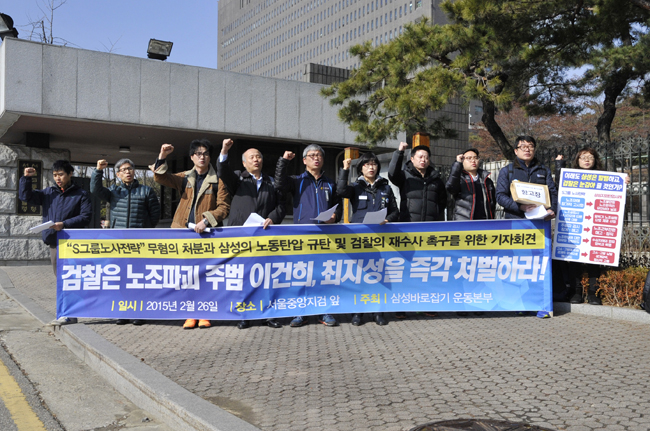 삼성바로잡기운동본부가 2월26일 서울 서초동 서울중앙지검 앞에서 삼성의 노조탄압 규탄과 검찰의 재수사를 촉구하는 기자회견을 열고 서울중앙지검에 ...