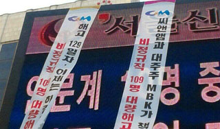 서울 프레스센터 인근 옥외 전광판에서 고공농성을 진행 중인 케이블 방송업체 씨앤앰 비정규직 노동자가 시민들의 관심을 호소하고 나섰다. 임정균 조...