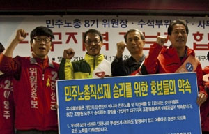 지난 8일부터 선거운동을 시작한 민주노총 임원 직선제 후보들이 13일 울산을 찾았다. 정용건(위원장)-반명자(수석부위위원장)-이재웅(사무총장),...