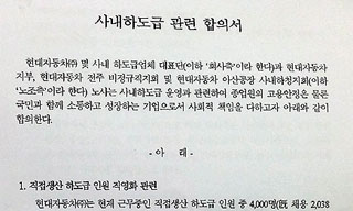 현대차 노사가 2015년 말까지 불법파견 사내하청 비정규 노동자 4000명을 특별고용 하기로 잠정합의(사내하도급 관련 합의서)하자 비판의 목소리...