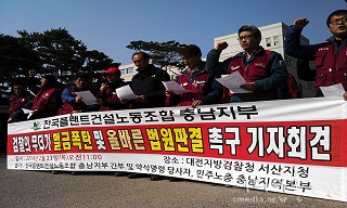 플랜트건설노조 충남지부, 민주노총 충남본부 등은 27일 오전11시 대전지방검찰청 서산지청에 기자회견을 열고 “검찰이 노조 조합원에게 자그마치 1...