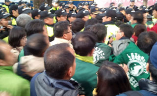 충정로 골든브릿지투자증권 앞이 무법지대가 됐다. 법원 판결에 불복해 노조 농성 천막을 강제 철거한 회사는 집회까지 막아서며 노조와 충돌을 빚고 ...