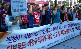 티브로드 외주업체에 소속된 비정규직 노동자들이 노조결성 6개월 만에 전면파업에 돌입했다. 희망연대노조 케이블방송 비정규직 티브로드지부는 4일 오...