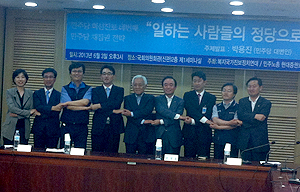 김한길 민주당 당대표와 박용진 복지국가진보정치연대 대표(민주당 대변인)가 진보정당의 노동정치운동 모델 중 하나였던 직장위원회 강화를 통한 노동자...