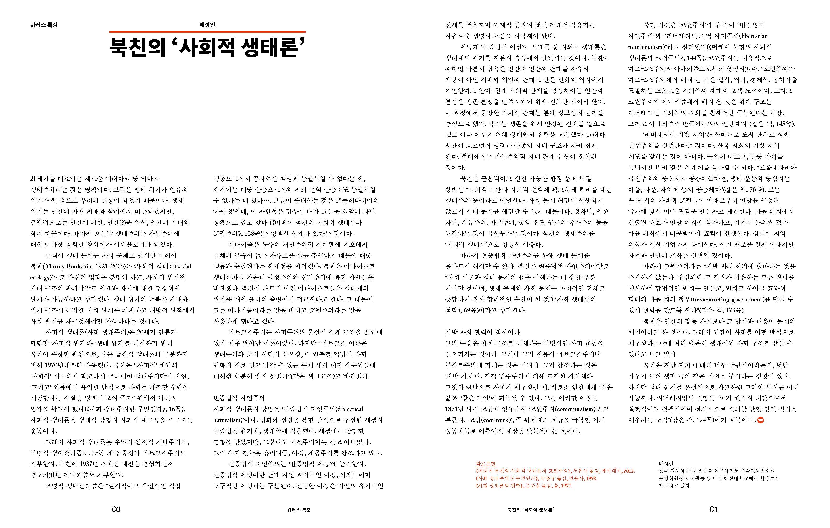 일찍이 생태 문제를 사회 문제로 인식한 머레이 북친(Murray Bookchin, 1921~2006)은 ‘사회적 생태론(social ecolog...