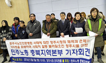 청주시가 2일 ‘법질서 확립’ 의지를 밝혔다. 지난 해 6월 병원 폐원으로 해고된 청주시노인전문병원(아래 노인병원) 노동자들이 ‘시청광장을 점령...