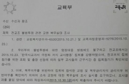역사 교과서 국정화에 반대하는 교사들을 조치하겠다는 방침으로 직권남용 비판을 받는 교육부가 국정화를 반대하는 학교 현장의 교사들을 색출하고 나서...