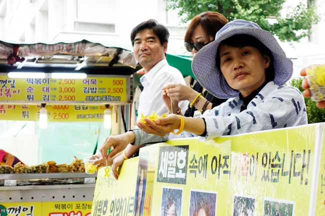 서울 지하철 홍대입구역 앞 8번 출구. 쉴 새 없이 사람들이 오고가는 틈에 다윤이 엄마가 서있다. 안산 단원고 학생 조은화, 허다윤, 남현철, ...