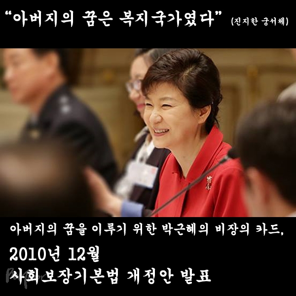 "아버지의 꿈은 복지국가였다" 아버지의 꿈을 이루기 위한 박근혜의 비장의 카드, 2010년 12월 사회보장기본법 개정안 발표. (당시 사회보장기...
