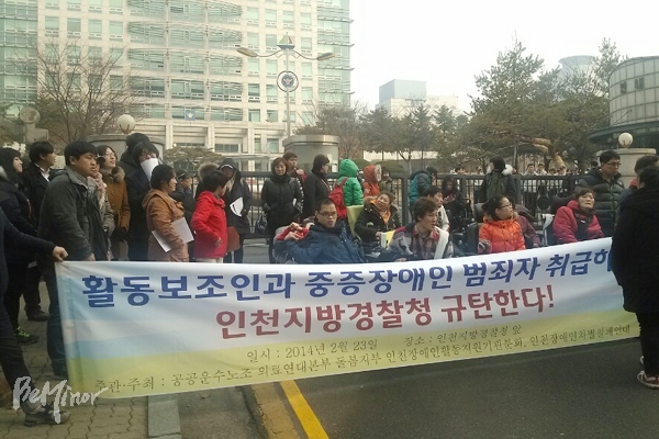 프란치스코 교황이 방한한 14일, 장애인계는 명동성당 내부에 난입한 경찰에게 참혹하게 폭행당한 사실을 알리는 기자회견을 열었다.
