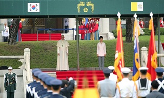 14일 교황 방한의 첫 공식 일정인 청와대에서 환영식이 끝나고, 국내 각계 인사와 주한 외교단, 교황청 인사 200여 명이 참석한 가운데 교황의...