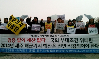 제주 강정마을 주민들이 상경해, 서울 여의도 국회 앞에서 “국회 부대조건 위배한 제주 해군기지 예산, 전면 삭감하라”고 촉구했다.