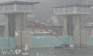 4대강 낙단보, 한파 폭설 속에 보수공사