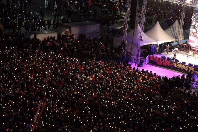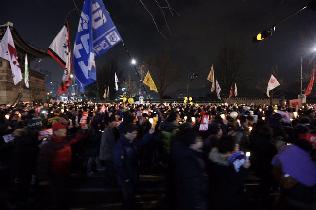 탄핵소추안이 국회를 통과한 다음 날인 10일 80만 명의 시민이 광화문 광장에 나와 박근혜 즉각 퇴진을 요구하는 촛불을 들었다. 서울 80만, ...