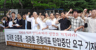범국본 법원 앞에서 긴급 기자회견을 갖고 "범국본 두 대표에 대한 구속영장 청구는 한미FTA 저지운동에 대한 명백한 탄압으로, 즉각 중단되어야 ...
