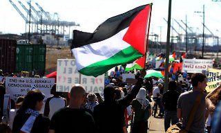 미국 샌프란시스코 활동가들이 4일 동안 오클랜드 항구에서 이스라엘의 가자 공격와 봉쇄에 반대하며 이스라엘 최대의 선사 짐라인(Zim Line)의...