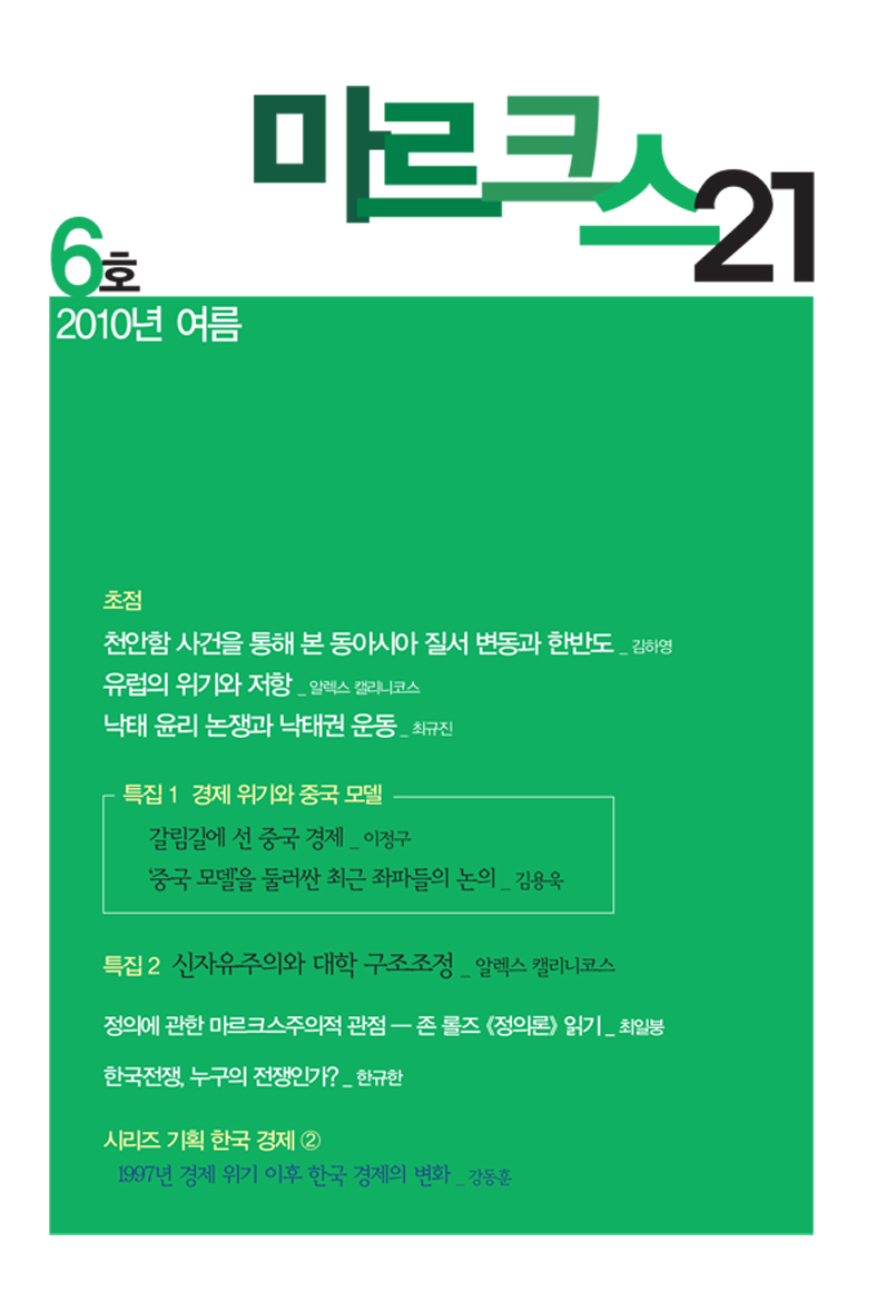 이번에 발행된 <마르크스21> 6호는 천안함 사건을 통해 본 동아시아 질서 변동과 한반도, 유럽의 위기와 저항, 낙태 윤리 논쟁과 낙...