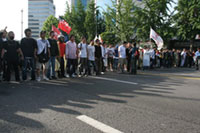 객사 근처에 9시께 경찰이 막아서 잠시 대치해 있다가 민중사관 사거리를 지나 인도와 차도 1선으로 한나라당사쪽으로 이동하고 있다. 나머지 차도는...