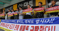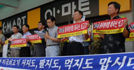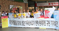 한미FTA저지대전충남운동본부(운동본부)는 13일 11시 롯데마트 서대전지점 앞에서 미국산 쇠고기 판매 중단을 요구하는 기자회견을 긴급히 가졌다.