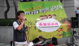 현대기아차 정문 앞에서 온 몸으로 쏟아지는 비를 맞으며 5일째 농성을 하고 있는 이백윤 금속노조 동희오토 사내하청지회장이 힘찬 발언을 한다. 동...