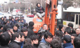 김혜자(고양시 행신동세입자투쟁위원회 위원장) 씨가 천막 앞에서 마이크를 잡고 목소리를 높인다. 그 앞에는 고양시 공무원 20여 명이 확성기와 소...