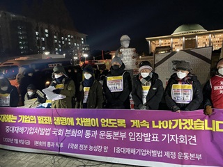 8일 국회 본회의에서 중대재해기업처벌법이 처리될 예정인 가운데 노동·시민사회단체들은 제대로 된 중대재해기업처벌법을 요구하며 집중 행동을 펼치고 ...