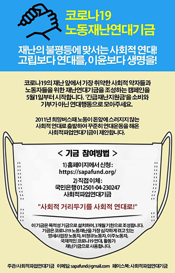 사회적파업연대기금(사파기금)은 5월 1일부터 7월 말까지 ‘코로나19 노동재난연대기금’을 조성하고, ‘노동 재난’을 가장 심각하게 겪고 있는 노...