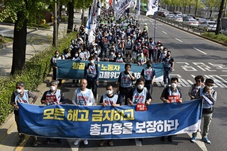 공공운수노조 소속 500여 명의 노동자들이 세계노동절을 맞아 코로나19 상황에서 모든 해고를 금지하라는 공동행동을 벌였다.