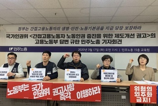 민주노총이 국가인권위의 간접고용노동자 제도개선 권고에 대한 노동부 답변은 사실상 수용률 0%라며 고용노동부를 규탄했다. 아울러 민주노총은 고용노...