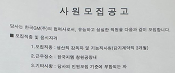 한국지엠 창원공장 하청 비정규직 노동자 585명이 해고 예고 통보를 받은 가운데, 신규 하청업체가 들어서 사원 모집을 공고했다. 여러 차례 불법...