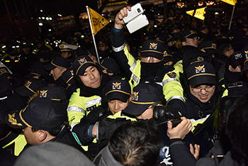 경찰이 27일 오후 6시경 정부서울청사 앞에 마련된 경마기수 문중원 열사의 분향을 방해해 노동자, 시민들과 충돌했다. 문중원 열사의 부인은 운구...