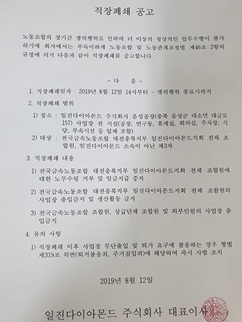금속노조 일진다이아몬드지회(이하 노조)가 전면 파업에 돌입한 지 48일째, 사측이 끝내 직장폐쇄를 실시했다. 일진다이아몬드는 지난 12일 오후 ...