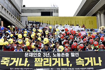 비정규직 노동자 200명이 27일 세종문화회관 계단에서 문재인 정부의 반 노동 정책을 규탄했다. 이날 노동자들은 '죽거나', '잘리거나', '속...