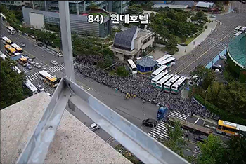 현대중공업이 31일 오전 본사 정문을 봉쇄했다. 사측은 버스 열 대로 차벽을 만들고, 용역 수백명을 같은 곳에 배치했다. 사측이 임시 주주총회를...